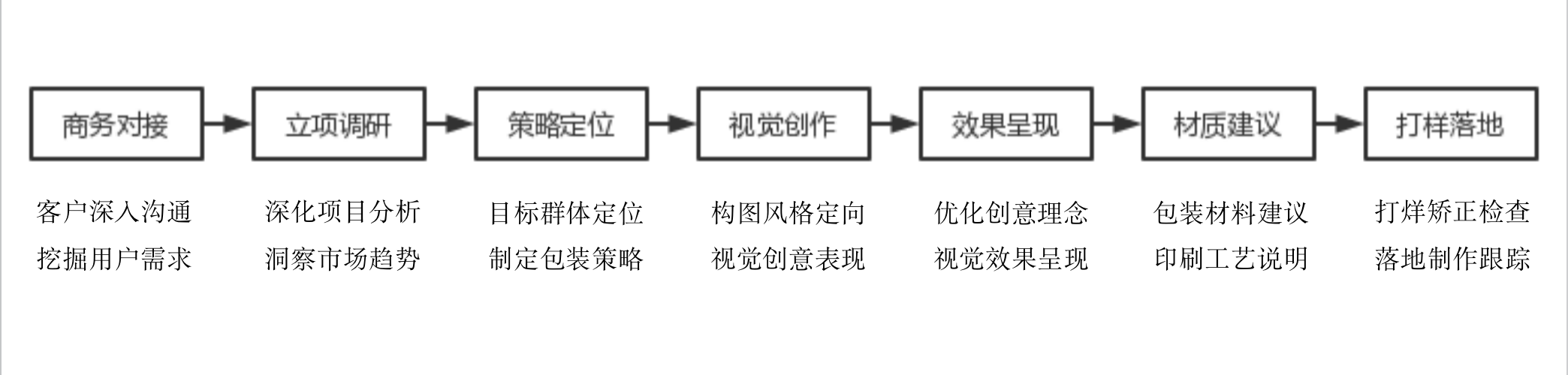 包装设计与制作的完整服务流程总共分为七大环节:商务对接、立项调研、策略定位、视觉创作、效果呈现、材质建议、打样落地。做好七大环节,才算项目完结。